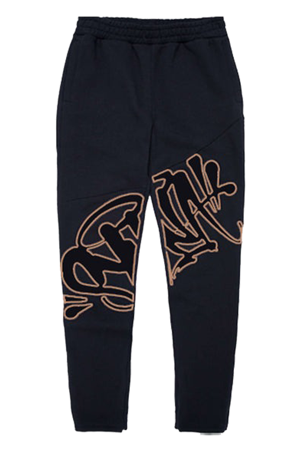 - Black sweatpants with bold neon gold “Syna” branding
